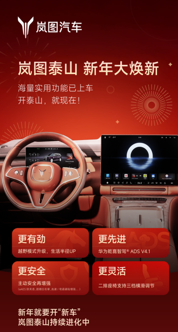 2026年2月4日,岚图汽车向岚图泰山车主正式推送首次重大OTA升级!此次升级以华为乾崑智驾ADS 4.1为核心,覆盖智能座舱、辅助驾驶、越野性能三大维度,用“商务+越野”双场景差异化优势,直接改写高端商务SUV的价值规则。