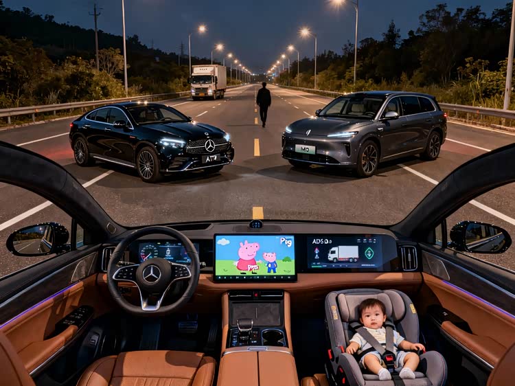场景体验得说点实在的。上周六晚上我开着试驾车跑了趟城郊高速,重点测了夜间智能驾驶。奔驰的L2级辅助驾驶确实稳,车道保持精准,但遇到前方大货车变道时,它只会减速不会主动避让,我得手动打方向;而问界M9的ADS 2.0,不仅能识别夜间路边的行人(穿深色衣服那种),还能预判大货车的动向提前变道,全程我只接管了一次(因为有辆电动车突然横穿)。更绝的是问界的后排:我把孩子的安全座椅放第二排,后排屏幕直接连上车载爱奇艺,放《小猪佩奇》时孩子全程安静;反观奔驰,后排只有两个USB接口,得靠手机支架和蓝牙耳机,哄娃效率差了不止一点。