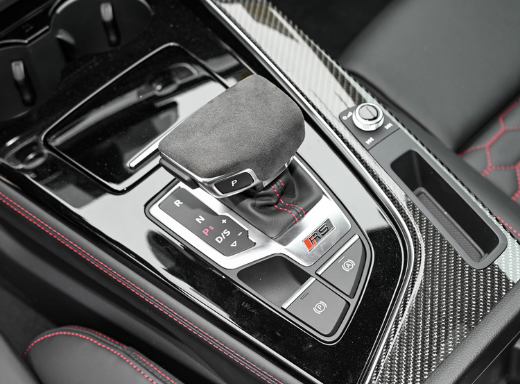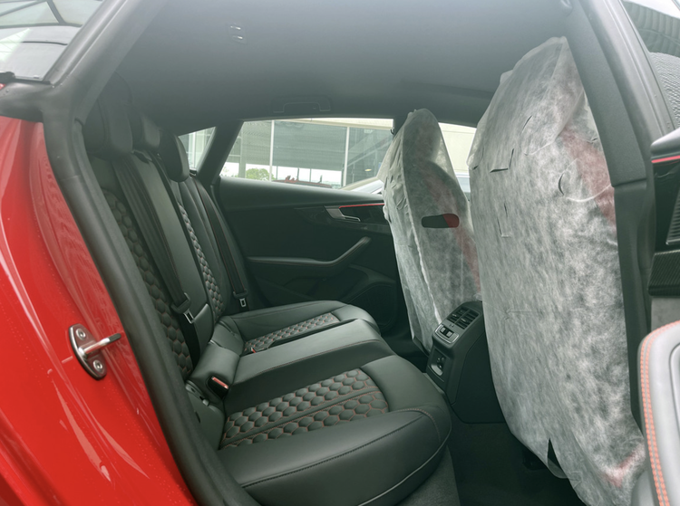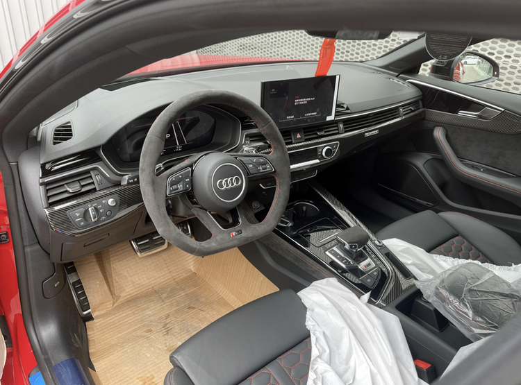 全新奥迪RS5车内采用了大面积黑灰色Alcantara面料铺陈,还加入了大量碳纤维装饰边框,还有大量红色手工双缝线、银色金属装饰条,还有贯穿式空调出风口,再加上优质的真皮皮革材质,打造出奥迪高性能车应有的豪华感和运动感。中控台配备了奥迪RS系列的平底式多功能方向盘,大尺寸换挡拨片、操控岛依旧是大家熟悉的风格,配备了符合人体工学设计的换挡手柄。前排配备了两个赛车化桶装座椅,不仅支持通风、加热、电动腿托,还加入了蜂窝样式的 坐垫和靠背,并提供了四点式安全带(选配),也带来了更好的操控体验。