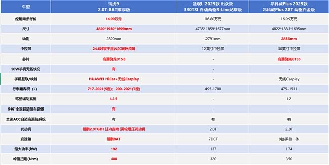 接下来,我们就以自主与合资中颇具代表性的瑞虎9 2.0T-8AT耀享版(以下简称:瑞虎9)、途观L 2025款 出众款330TSI自动两驱R-Line龙耀版(以下简称:途观L)、昂科威Plus 2025款 昂科威Plus 28T 两驱白金版(以下简称:昂科威Plus)为例,看看谁更适合中国家庭出行。