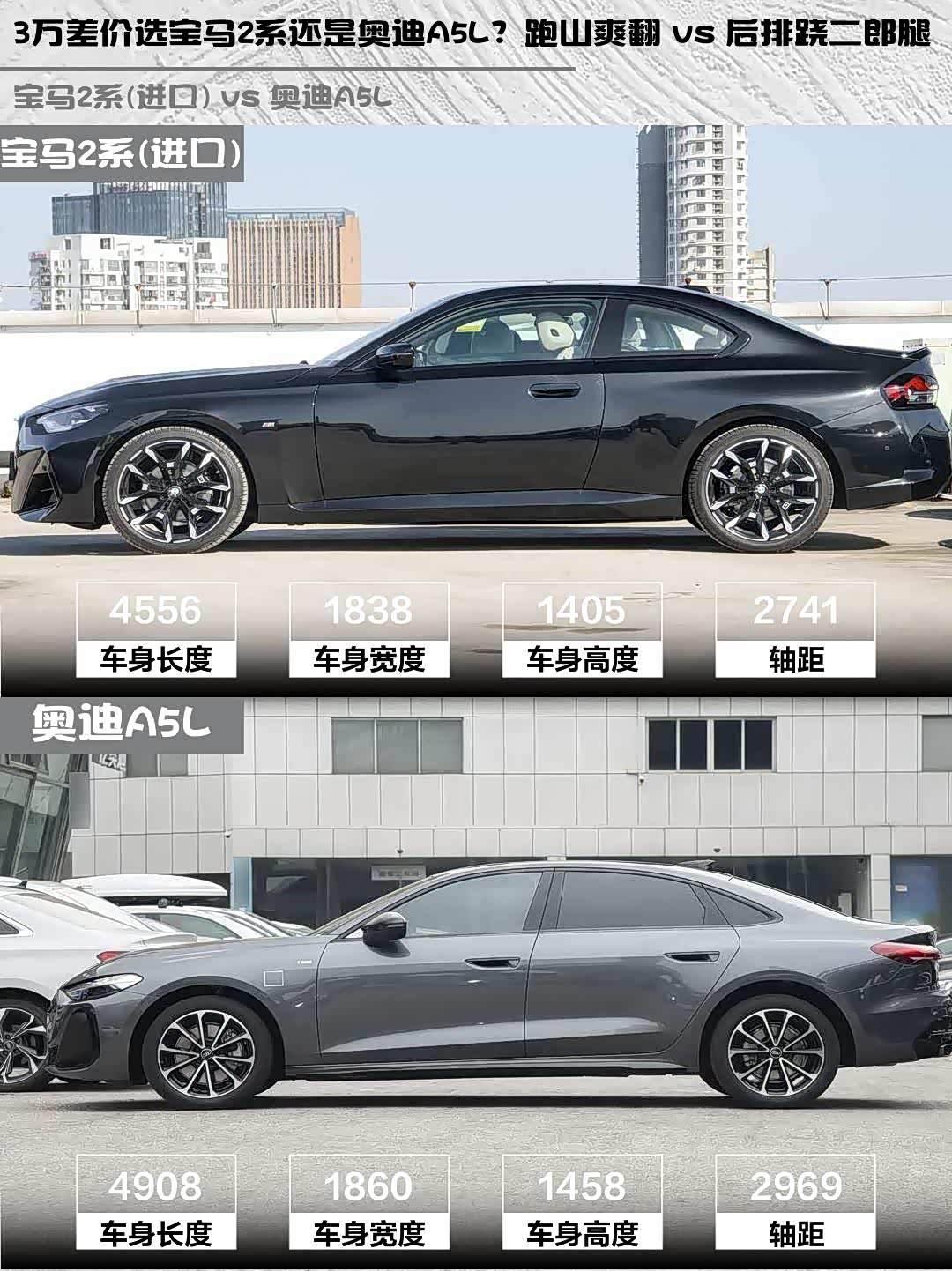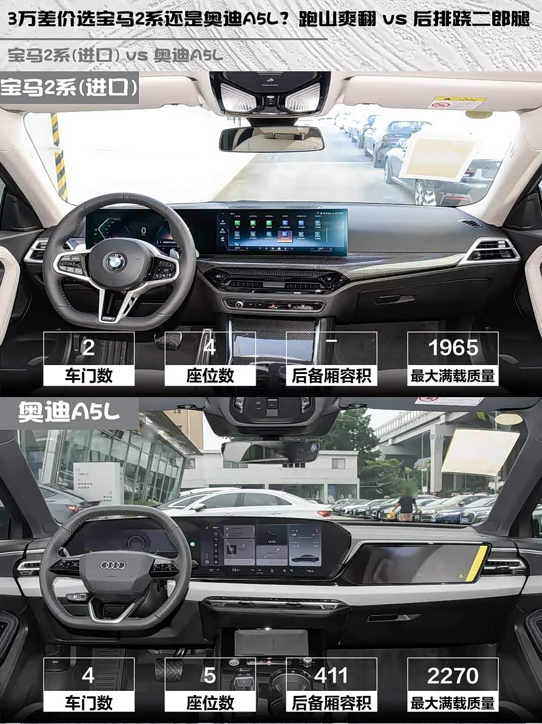 空间实用性反转了!奥迪A5L 2969mm轴距真不是盖的,后排能跷二郎腿,后备箱塞4个登机箱无压力。宝马2系后排就惨了...身高超过175的兄弟顶头又顶腿,也就放放包的水平。所以经常带人的话,奥迪才是正解✅