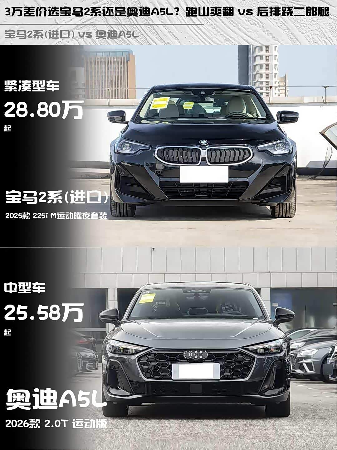 最近后台好多人在问 宝马2系(进口)(参数|询价) 2025款 225i M运动曜夜套装和奥迪A5L 2026款 2.0T 运动版怎么选?作为深度体验过两台车的玩家,今天从真实驾驶角度给你们扒一扒细节🔥