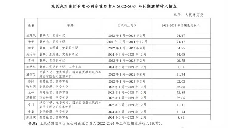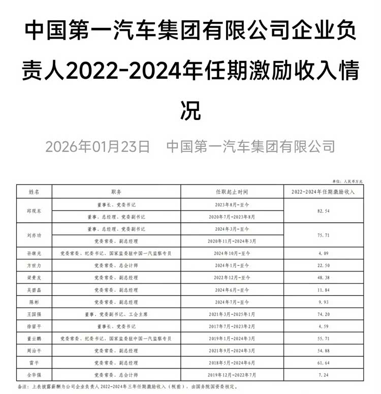 2月3日,国务院国资委网站披露了所监管的80多家中央企业负责人2022-2024年任期激励收入。通常可以理解为年终奖。在两大汽车央企中,中国一汽的董事长邱现东任期激励收入为82.54万元。东风汽车集团的董事长杨青在任董事、总经理、党委副书记期间激励收入为34.25万元(2022年1月-2023年9月),任董事长、党委书记期间激励收入24.47万元(2023年10月-2024年12月)。