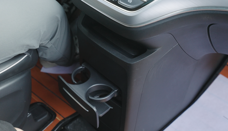 扶手处还有一个弹出式的杯架,要收回去直接往回推就能搞定,材质上它是全塑料,用久了之后会卡滞。