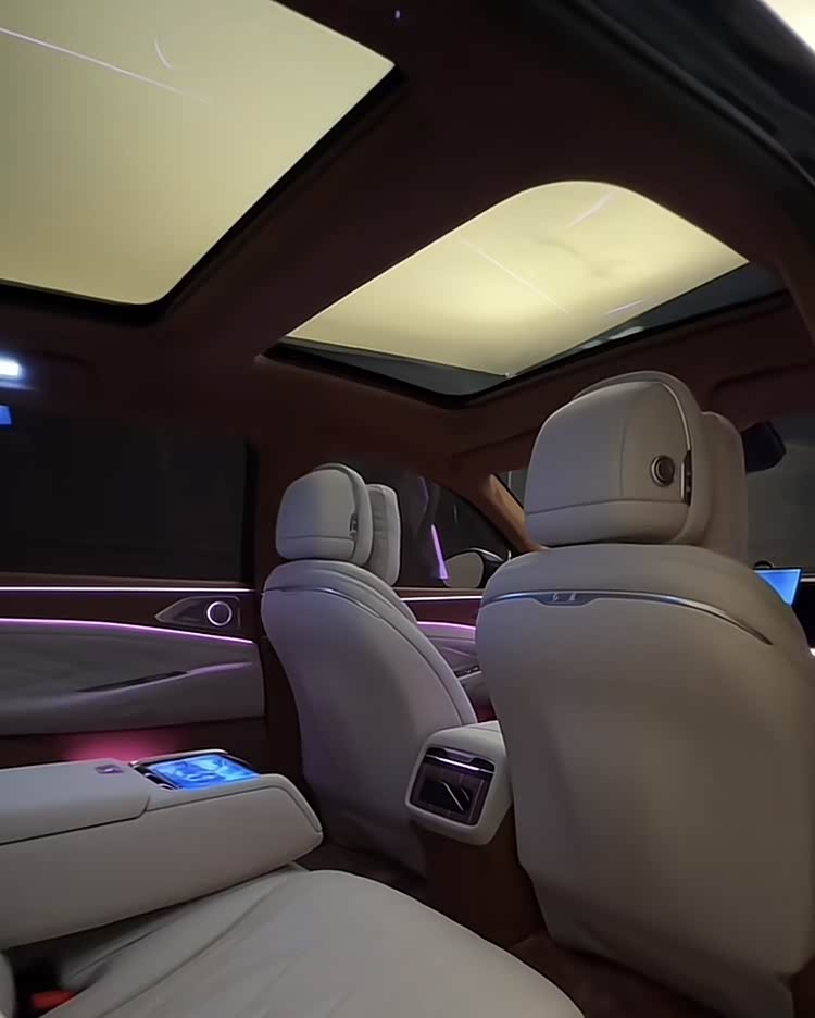 后排配备零重力慢回弹座椅,宽大的中央扶手上配备扶手屏,预计可调节座椅通风、加热、按摩等功能,后方疑似还提供智能冷暖冰箱。另外还将搭载丹拿音响、双天幕、恒温氧吧系统等。