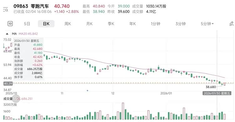 自2025年10月以来,零跑汽车股价陷入下行通道。刚刚过去的1月,股价下挫12.75%,为近4个月以来跌幅最惨的一个月。进入2月,下跌仍在持续,截至2月4日收盘,报收40.74港元。