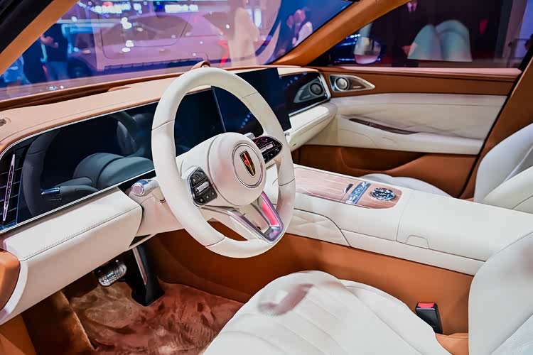 在豪华氛围的营造上,新车毫不吝啬。白与棕双拼的内饰色调,搭配大量软质皮革、麂皮面料包覆,以及木纹饰板、璀璨水晶质感的装饰件,还有环绕整个座舱的氛围灯带,细节之处尽显高级质感。中控台中央镶嵌着一枚圆形石英钟,表内刻有“红旗”与“1958”字样,于现代科技中流露出品牌的历史底蕴。此外,新车换装了全新的多功能方向盘,并采用电子怀挡式换挡机构。