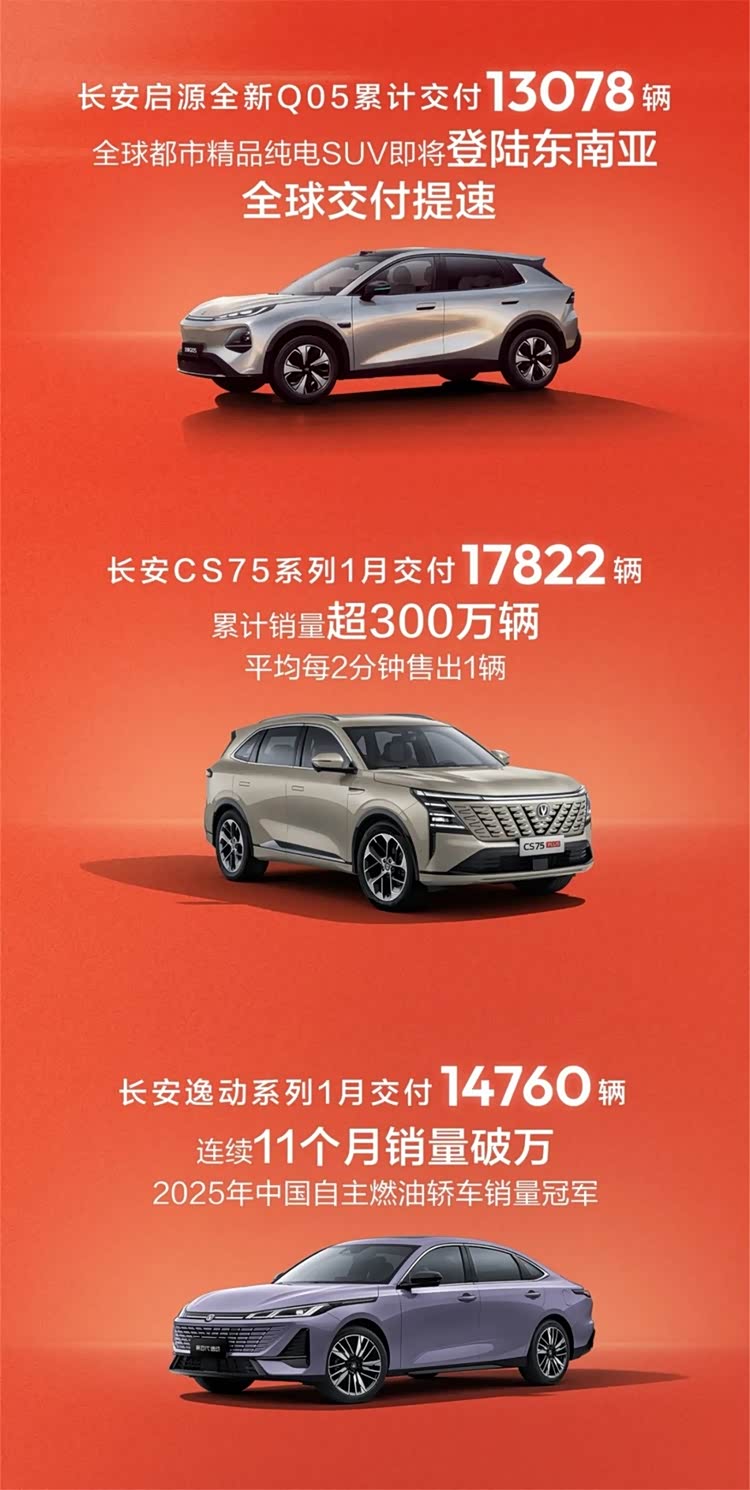 全球汽车产业向新能源转型的浪潮中,长安坚持“燃油车守根基、新能源拓新局”双线战略,1月交付数据充分印证了这一战略的科学性——经典燃油车释放品牌韧性,新能源板块加速突破,形成双向赋能的良好态势。