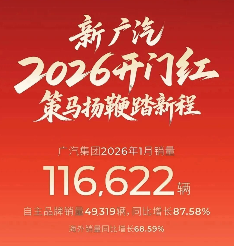 最新公布的2026年1月销量数据为广汽集团的转型战略提供了有力注脚。全集团整体销量达11.66万辆,在行业整体偏弱的环境中实现了18.47% 的同比增长。