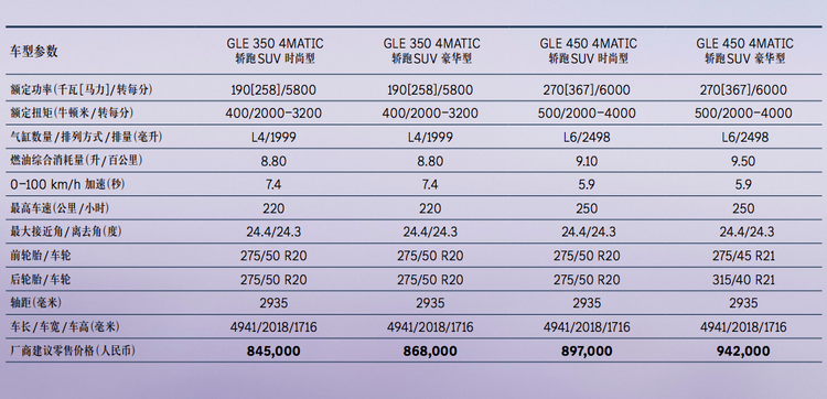 作为年度改款车型,2026款奔驰GLE轿跑SUV的外观及内饰设计、动力等没有变化,全系采用2+3式座椅布局。在此基础上,2026款奔驰GLE轿跑SUV标配48伏智能电机系统,匹配9速自动变速箱,其中GLE 350系列车型搭载最大功率190千瓦、峰值扭矩400牛·米的2.0T四缸发动机,GLE 450系列车型搭载最大功率270千瓦、峰值扭矩500牛·米的2.5T六缸发动机。