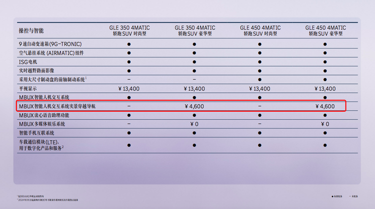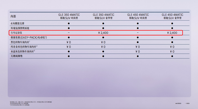 2026款奔驰GLE轿跑SUV的漆面选项进一步丰富,新增MANUFAKTUR蔚蓝海岸浅蓝色金属漆和MANUFAKTUR矽谷灰色非金属漆。另外与2025款对应配置车型相比,GLE 350 4MATIC轿跑SUV豪华型和GLE 450 4MATIC轿跑SUV豪华型不再标配行车记录仪、MBUX智能人机交互系统实景穿越导航,目前两项配置的选装价格分别为2400元、4600元。