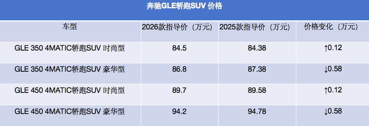信息显示,2026款奔驰GLE轿跑SUV的定价相比2025款车型有升有降,其中GLE 350 4MATIC轿跑SUV时尚型和GLE 450 4MATIC轿跑SUV时尚型的官方指导价上涨1200元,GLE 350 4MATIC轿跑SUV豪华型和GLE 450 4MATIC轿跑SUV豪华型的官方指导价下调5800元。