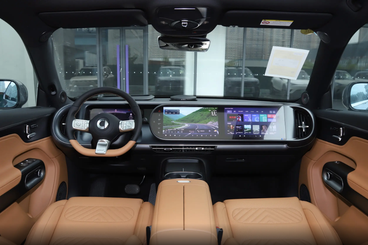坐进车里,浅蜜棕色内饰特别温馨,满满居家感。用料和做工在同价位里很有诚意。中控是两块13英寸 AMOLED屏的椭圆一体式设计,比普通悬浮屏整体感强多了,再加上10.3英寸全液晶仪表和25.6英寸AR-HUD,多屏联动用着超顺手。各屏分工清晰:仪表看车速、续航这些基础信息;AR-HUD把导航、车速、限速投到前挡,不用总低头;左中控屏调空调、驾驶模式、看能耗;右屏管娱乐、导航、音乐,还能分屏,边导航边听歌超方便。