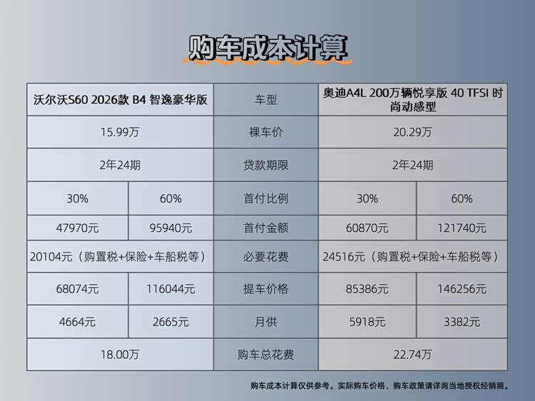 通过两车对比就能清晰看出,入手沃尔沃S60的资金压力要小不少,后续还款压力也更小。不过需要注意的是,小编在本文内展示的购车成本计算仅供参考,实际的购车价格、购车政策请大家详询当地授权经销商。