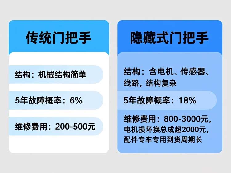 传统机械门把手,虽然看起来普通,但“一拉即开”,可靠性强,5年故障概率仅6%,维修成本低,不管是北方低温天气,还是紧急情况,都能稳定发挥;而隐藏式门把手,除非你是南方用户、追求颜值和仪式感,且愿意接受它的短板,否则真的没必要为了车商口中的“高级感”多花冤枉钱。