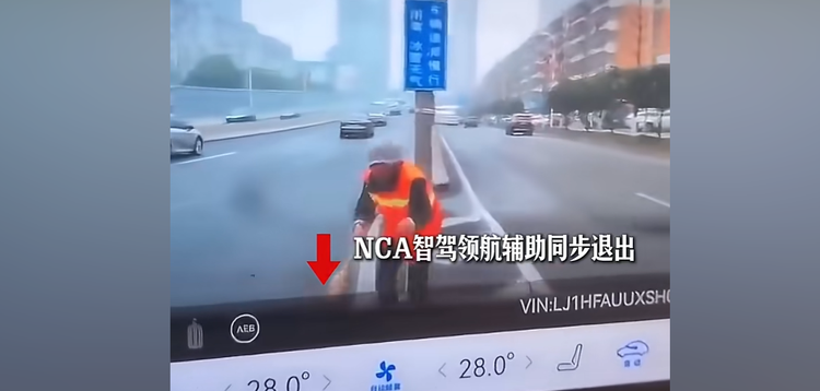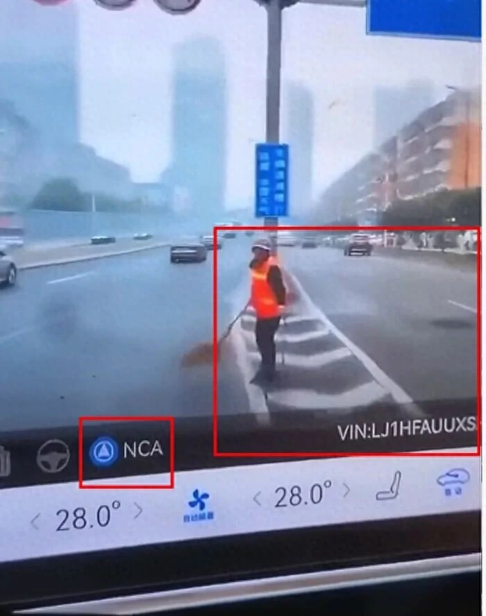 通过网络上的视频来看,这台车本来是在正常行驶,行驶到快要上桥的路口时,突然向右拐,但右边是导流线,可能是基于智驾系统尽量不压实线的逻辑,在车辆压线后又朝左边打了一把方向,但车辆没有减速停止的趋势,直接撞到了站在导流线上的一位环卫工人。