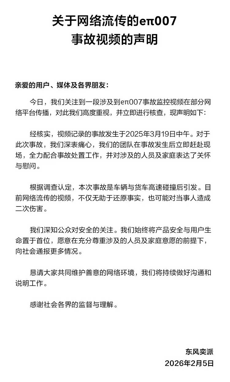 对此,奕派在2月5日下午对该事件进行了回应。奕派表示:经核实,视频记录的事故发生于2025年3月19日中午。而不是传言中的2026年2月3日。奕派表示,此前在此次事故发生后,团队立即赶赴现场,全力配合事故处置工作,并对涉及的人员及家庭表达了关怀与慰问。