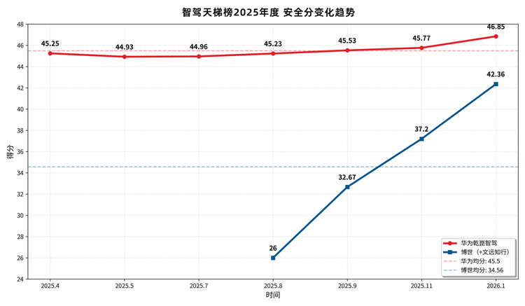 华为安全分表现长期稳定,体现其在边缘场景、异常目标识别以及交通规则执行方面形成系统性优势,背后是大规模真实行驶数据积累以及持续训练优化能力。过去7期的数据分别为:2025年4月45.25分、5月44.93分、7月44.96分、8月45.23分、9月45.53分、11月45.77分、2026年1月46.85分,均分45.50分(满分50分),且每期得分都超过了44分,按百分制折算,是唯一年度安全榜得分在90分以上的方案。