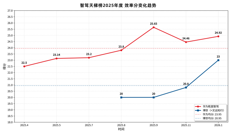 这是华为乾崑智驾的“领先区”,7期数据分别为:2025年4月22.50分、5月23.14分、7月23.20分、8月23.80分、9月25.65分、11月24.46分、2026年1月24.92分,以23.95平均分拿到2025年度效率榜第一。