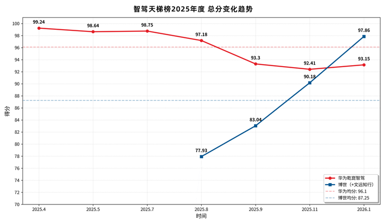 根据智驾天梯榜2025年度总榜数据,博世(+文远知行)与华为乾崑智驾的总分曲线呈现为两条不同的变化路径。
