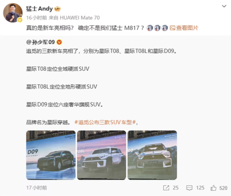 然而,这一发布很快引发了争议。猛士汽车科技公司副总经理@猛士Andy 随即在社交平台上发文质疑:“这真的是全新车型亮相吗?确定不是我们猛士M817?”并附上两张车型的对比图。