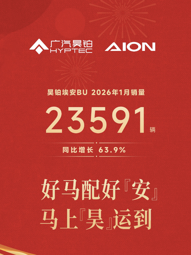 数据显示,在BU架构下,广汽昊铂埃安BU 2025年12月实现销量突破4万辆,其中基于用户需求研发的埃安i60车型上市首月销量即破万辆,C端销售占比持续提升。在哀号遍野的1月,昊铂埃安BU销量达23591辆,同比增长63.9%,成为少数正增长的企业,而且增幅表现突出。
