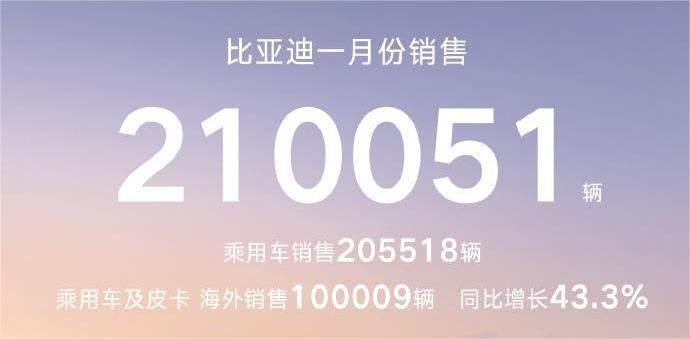 比亚迪1月销量约21万辆,同比下滑30.11%。下滑主要受国内市场需求透支及行业周期性调整影响。