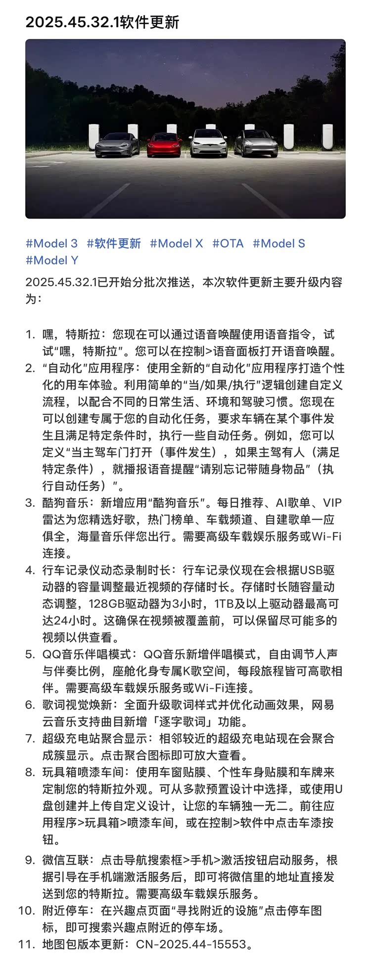 日前,我们从特斯拉官方获悉,特斯拉向全系车型推送了 2025.45.32.1 版本 OTA 更新。从功能构成来看,这次升级并未涉及动力、底盘或三电参数调整,而是将更新重心放在车机系统、语音交互、导航充电以及娱乐生态等高频使用模块上。对于已经熟悉特斯拉操作逻辑的用户而言,这次更新更像一次“用车细节补齐”,核心目标并不是制造新鲜感,而是减少操作步骤、提升连续使用效率。