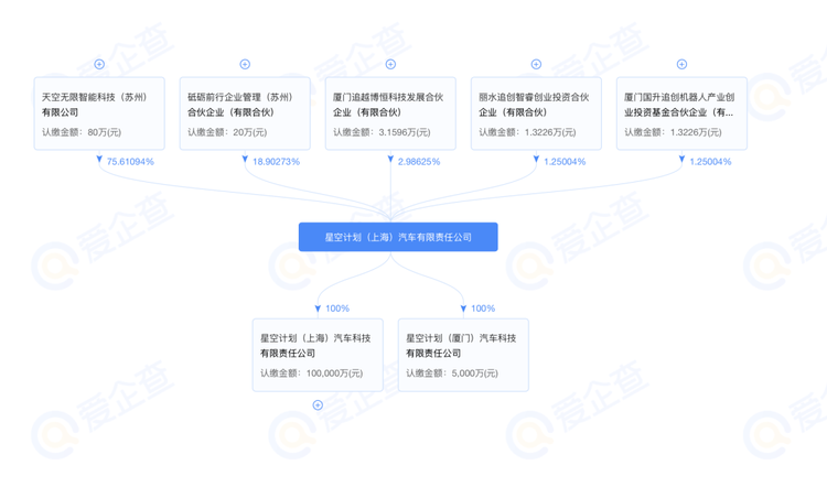 而这家天空无限又通过认缴80万元的方式控股星空计划(上海)汽车有限公司75.6%的股份。而这家造车的星空计划注册资本105.8048万元。