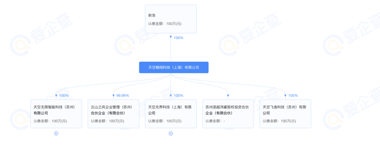 根据爱企查的信息,俞浩成立了100%控股的天空翱翔科技(上海)有限公司,他认缴100万元;而天空翱翔又以认缴100万元的方式100%控股天空无限智能科技(苏州)有限公司;