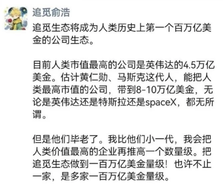 这只是俞浩的牛刀小试。俞浩追觅科技的掌舵人,造车圈新晋“巨佬”。在这次年会之前,俞浩已经流量不断了。先是被爆出遭员工“贴脸开大”:“药嗑多了?一年超过英伟达,一年超过中国所有车企30年未达成的成果”