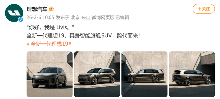 同时值得注意的是,就在昨天,李想在社交媒体上发文,称全新理想L9将把车变为智能体,还提到:“2026年,理想开启第二个十年。全新理想L9,不仅是一台好车,更是具身智能机器人的开山之作。我们准备了十年,就等这一刻。”