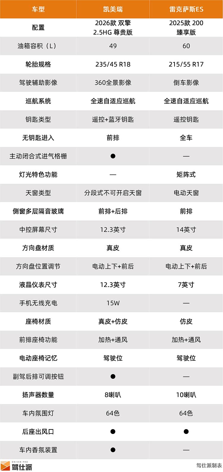 鸡头还是凤尾,是买合资中高配,还是豪华入门款?本系列2026春节前选车导购,第3期,我们来说说凯美瑞2.5L双擎和 雷克萨斯ES(参数|询价)200怎么选?