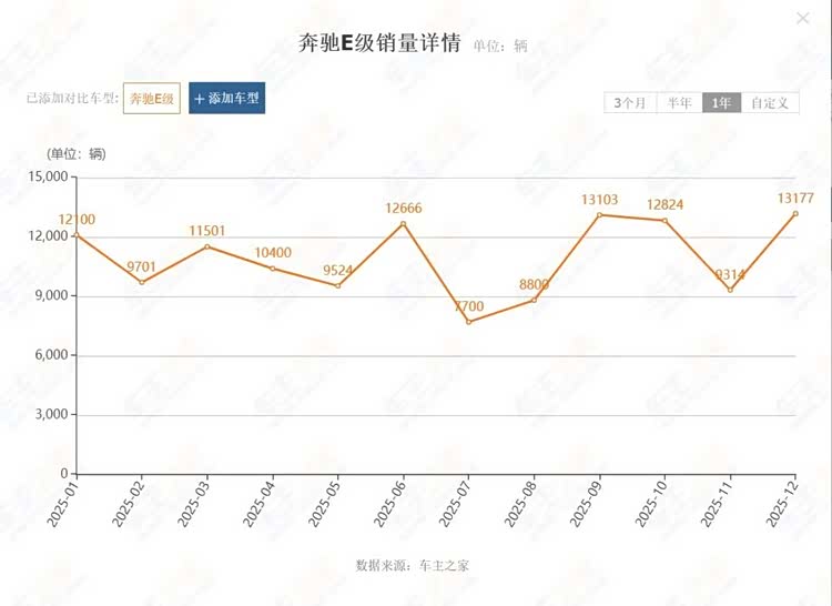 奔驰E级同样展现出强劲的市场吸引力,2025年累计销售130810辆。在去年11月价格调整后,12月销量迅速攀升至13177辆,稳守了在中大型豪华轿车市场的阵地。