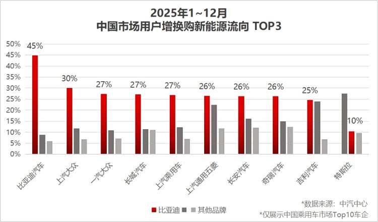 不止如此,比亚迪还具有很强的“虹吸效应”,根据中汽中心提供的数据来看,中国用户增换购新能源流向趋势中,比亚迪流向趋势高达45%,无论是合资品牌,还是其他国产品牌,在增换购新能源汽车时,比亚迪都是首选品牌,45%的概率已经很高了,在TOP 10车企用户中,平均4个增换购新能源用户中,就有1个选择了比亚迪。这一数据印证了比亚迪在新能源汽车市场中的统治力以及成为增换购用户的核心流向品牌。