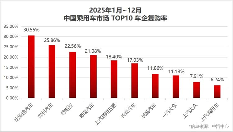 到了新能源汽车时代,中国乘用车市场复购率最高的品牌已经发生了改变,根据中汽中心提供的数据来看,比亚迪的复购率高达30.55%,超过了吉利、特斯拉、奇瑞、长安等品牌,很多比亚迪老车主在增换购的时候,还是会选择比亚迪,这就说明他们对比亚迪的用车体验十分满意,甚至超出了自己的期待,所以在换车或增购时,就不会更换品牌。