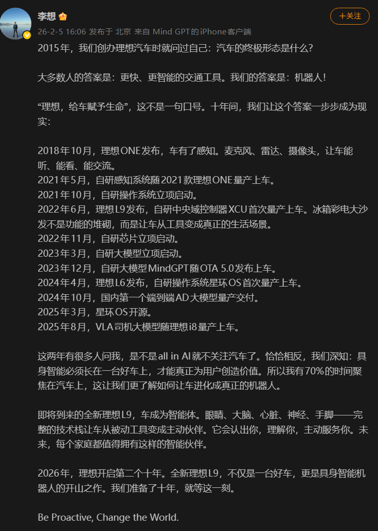在2015年创办理想汽车时,李想和团队就认为汽车的终极形态是机器人。在过去十年,理想逐步完成了一系列汽车智能化的进程,先让车“能听、能看、能交流”,再让车从工具变成生活场景的载体(车和家),现在终于要让车成为真正懂你、主动服务的智能体。