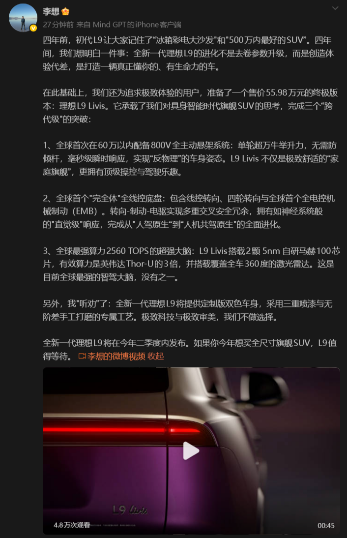 根据李想在2月6号发布的微博内容显示,全新理想L9将用上自研芯片、自研模型、自研全主动悬架等“跨代级”配置,目标成为行业首款定位具身智能的汽车。