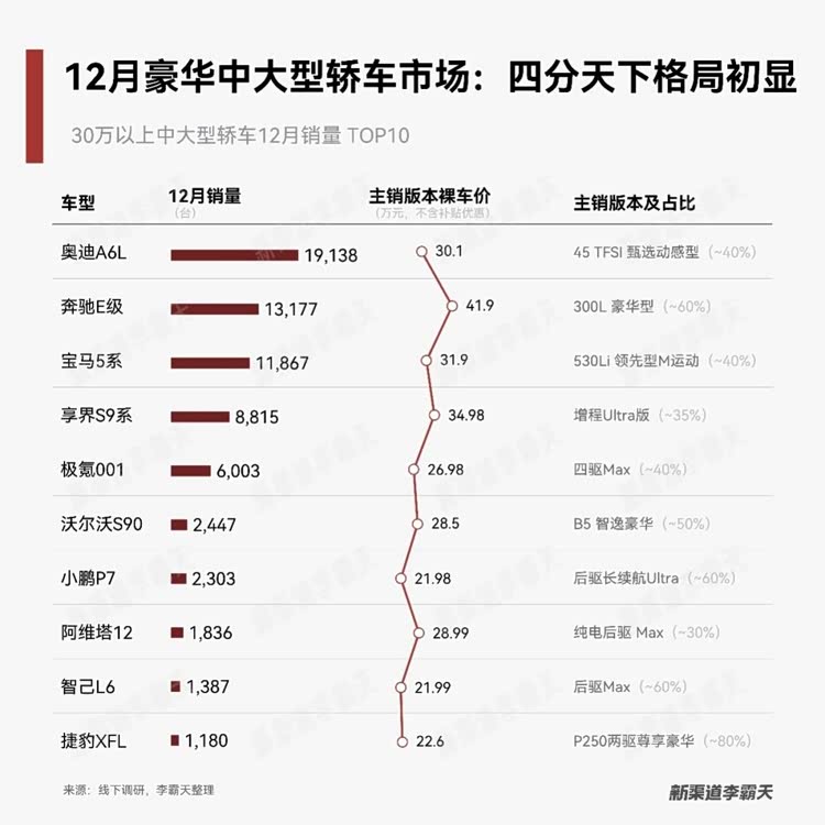 BBA 构筑的豪华车市垄断格局,曾是新势力难以逾越的壁垒。伴随新能源转型浪潮,行业竞争规则迭代,享界以精准用户洞察与扎实产品力,凭亮眼销量打破固有格局。2025 年 12 月,享界月度销量达 8815 台,轿旅双子星 S9 与 S9T 协同发力,其中 S9T 以 7186 台的成绩稳居 30 万以上中大型轿车销量 TOP4,覆盖中大型轿车及轿旅细分市场,推动品牌跻身 30 万以上豪华核心区。从追随者到同台竞技者,享界完成了身份跃迁,2026 年更将成为夯实优势、推动 “SBBA” 格局定型的关键之年。
