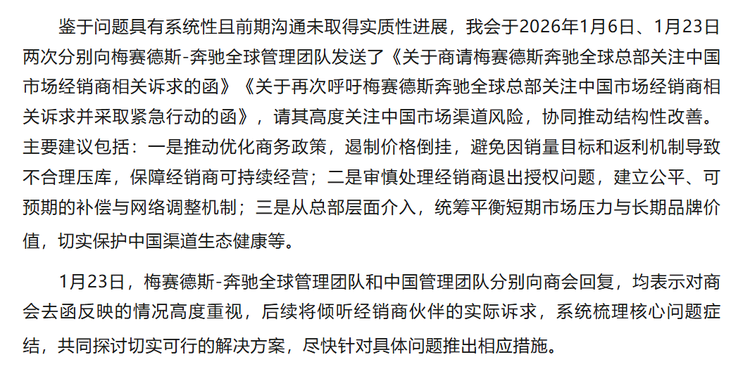 由于与奔驰中国沟通无果,商会采取了“越级上书”策略。2026年1月6日,商会第二次发函,这次直接将问题提交至梅赛德斯-奔驰全球管理团队,请求总部层面关注中国市场渠道风险的紧迫性。