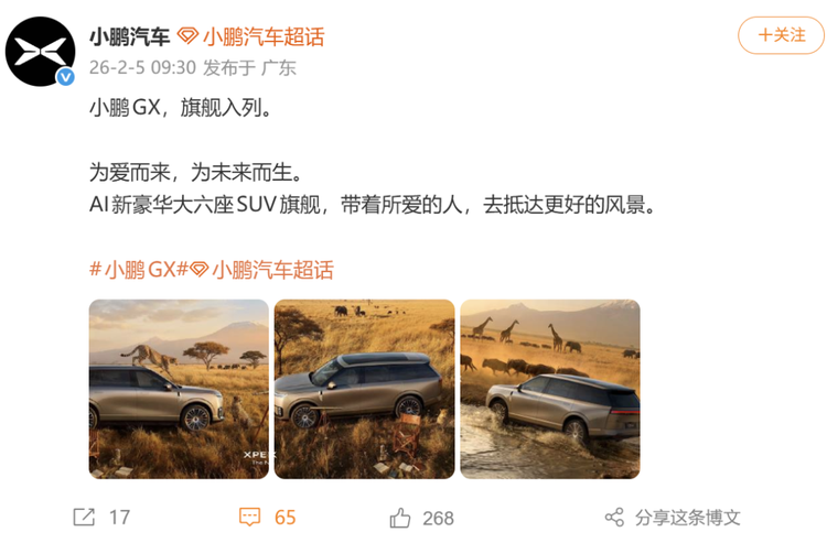 近日,小鹏汽车正式发布全新旗舰级大六座SUV 小鹏GX(参数|询价)官图。小鹏汽车董事长何小鹏表示,“X”,代表着对出行美好未知的探索(eXploration),更代表着小鹏骨子里的科技基因(X-tech)——坚持用技术,彻底解决问题。
