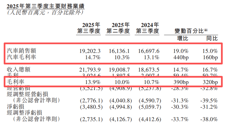 深入分析2025年前三季度数据,能更清晰地看到蔚来盈利改善的轨迹与可持续性。2025年前三季度蔚来营收分别达120.35亿元、190.08亿元、217.94亿元,呈逐季攀升态势。其中三季度,汽车销售收入192.02亿元,同比增长15.0%、环比增长19.0%,综合毛利率达13.9%、整车毛利率14.7%,均创近三年新高。尽管三季度仍净亏损34.8亿元,但同比下降31.2%、环比下降30.3%;经调整净亏损27.4亿元,同比下降38.0%、环比下降33.7%,亏损幅度大幅收窄,为四季度盈利奠定了坚实基础。