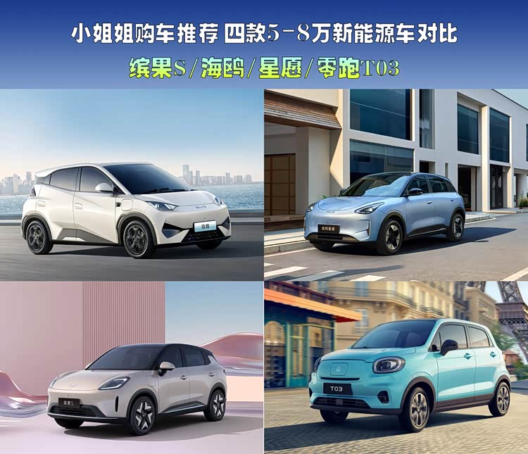 预算5-8万元,目前市场上有 五菱缤果S(参数|询价)、比亚迪海鸥、吉利星愿和零跑T03等几款主流纯电车型可供选择。吉利星愿官方限时起售价为6.58万元。零跑T03的起售价为5.99万元,部分经销商优惠后起售价可低至5.04万元。这些车型尺寸相当,均为纯电驱动,支持快充,续航普遍在300-400公里级别,满足日常通勤和城市周边出行需求。