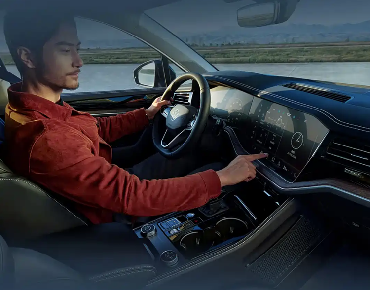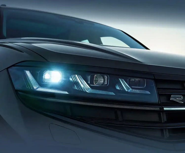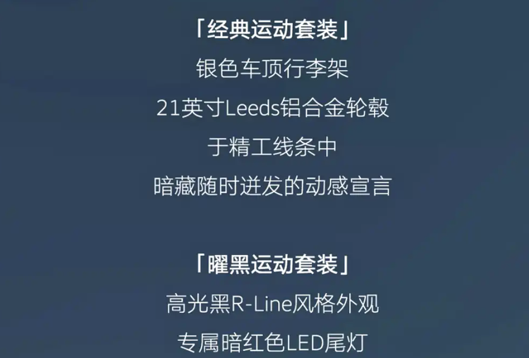 曜黑运动套装包含高光黑R-Line风格外观组件、21英寸Leeds轮圈、车顶行李架以及专属的暗红色LED尾灯,整体运动感突出。内饰延续了现款布局,采用平直的中控台线条,配备三辐式多功能方向盘、12英寸全液晶仪表以及15.05英寸悬浮式中控屏。