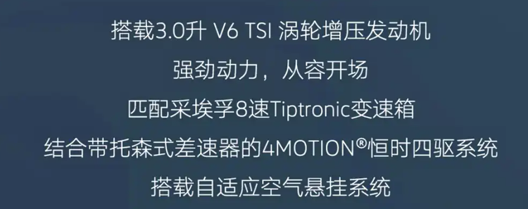 配置方面,新车提供360度全景影像与智能泊车辅助等实用功能。动力方面,新车搭载3.0T V6涡轮增压发动机,最大功率340马力,峰值扭矩450牛·米,传动系统匹配采埃孚8速手自一体变速箱。车辆同时配备了带托森中央差速器的4MOTION全时四驱系统以及自适应空气悬架系统。
