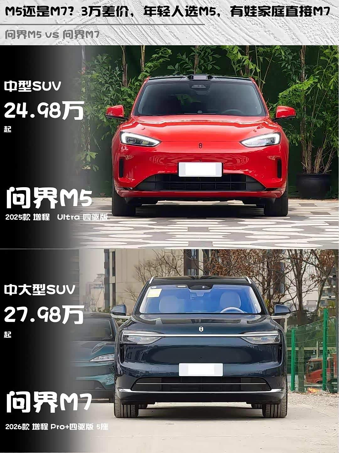 M5 Ultra四驱版24.98万,M7 Pro+四驱版27.98万。差价3万主要换来:更大空间、更豪华配置、更强智驾。如果经常全家出行,建议直接上M7;要是90%时间自己开,M5的操控乐趣绝对值得!