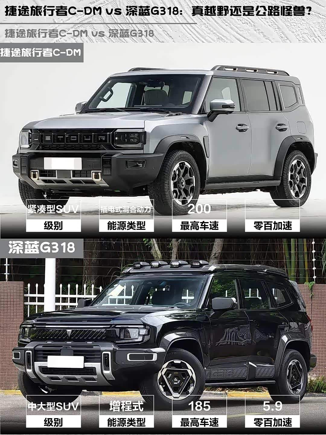 最近被两款硬派新能源SUV疯狂种草—— 捷途旅行者C-DM(参数|询价) 2026款 211km XWD 征服和深蓝G318 2025款 无忧穿越版 四驱远山版!作为20万级越野新势力,这两台车到底怎么选?实测对比干货送上👇
