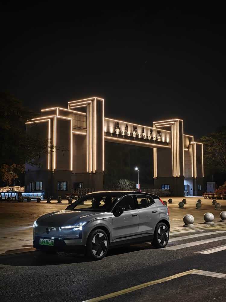 最后一个分岔路,本应向右的我打了左转灯,开往母校。寒假已开始,黑漆漆的校内空无一人,所以我将EX30停在校门口,留下了EX30和校门的合影。水泥灰的车漆在昏暗的路灯下闪耀着,大灯在黑夜中将自己的美感表现得淋漓尽致,匆匆拍完后,我开着它回到酒店楼下充电,准备第二天满电归还。