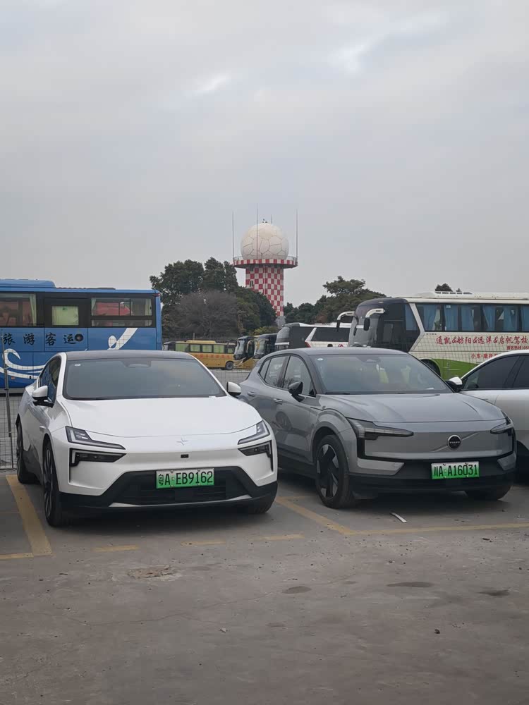 与朋友午餐后,装上三台相机,我把EX30开上跨海大桥,开往高崎机场旁的驾校——那里能直接看到机场跑道与航站楼。停车场里停满了极星4,看起来像是某家租车公司的批量采购车,我把EX30停在其中一台的旁边,让这对同门师兄弟作个伴——是啊,你们最终都成了租赁车。