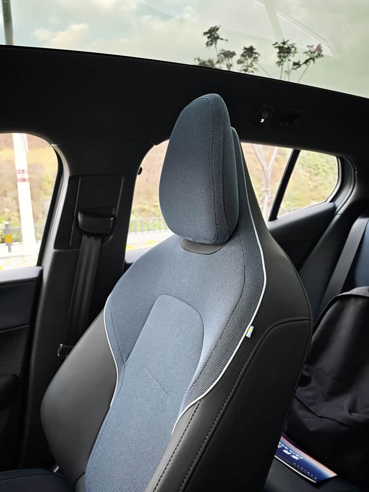 空间与乘坐舒适度表现可以说是明显短板了,尤其是后排乘坐与储物空间。前排两个座位还算是能舒展得开,座椅本身偏硬但也没什么不妥,后排就是完完全全的噩梦——在我拍的live图里,记录下了我不太文明的评价——首先开门角度就很小,朋友上车时差点被打到头,空间很小很拥挤,我们两个身高165-170cm的人在后排都觉得腿部空间所剩无几,头部空间倒是还算充裕,但如果给这块天幕装上一块遮阳帘,想必也会被侵占一部分空间。